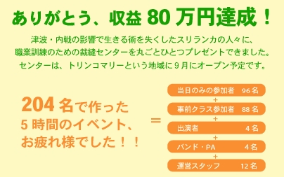 この度、Nanaさんを始め多くの方々のお力添えにより「Charity Gospel Marathon2008」を開催できましたことを、大変嬉しく思っております。このイベント収益は全て、スリランカ北部トンコマリーに建設計画中の裁縫センター開設資金として、責任を持って使用させていただきます。スリランカ北部には、激しい内戦と壊滅的な津波の被害を受け、貧困の中でなんとか命をつないでいる家族が大勢おります。この裁縫センター建設の目的は、そうした状況にある女性たちへ、裁縫技術の習得を通して生計を立てる手段を提供することです。