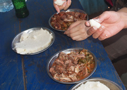 こちらの白いものはウガリといってこの地域の代表的な主食の一つ。トウモロコシや小麦、キャッサバなどの粉をこねて蒸したもので、モチモチした食感。郷に入れば郷に従え。教わりながら、手で食べる本場のやり方に挑戦!