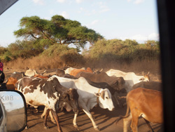 車がナイロビ近郊を走る内は、交通量も多く、工場など近代的な建物も見えますが、ほどなくして道路で行き交うものといえば家畜の群れなどに。突然目の前に現れて横断することもしょっちゅうです。ここでは今の所、動物が優先。