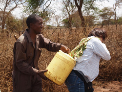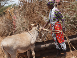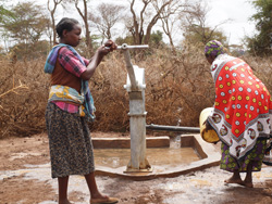 私達が視察に訪れた時にも、このように水を汲みにきている女性や子供達が次々に。半径5キロほどの土地に住む方々が利用し、20リットルのポリタンクを2本も背負って一日3往復することが女性達にとって日常。それでも、ここに井戸がなかったら、もっともっと遠くまで過酷な道のりを歩かなければならない・・・。