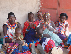 マサイのウィメンズグループの女性達。やり方を教えてもらいながら、ビーズアクセサリー作りに私達も挑戦させてもらいました。