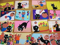 この紙芝居は、「衛生」の大切さを教えるためのもの。ストーリーはIWP代表の大野さんの作品です。それを私達有志がチームを組んで、イラストを書き、色を塗り、このツアーの出発にあわせて完成させました。