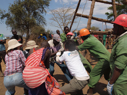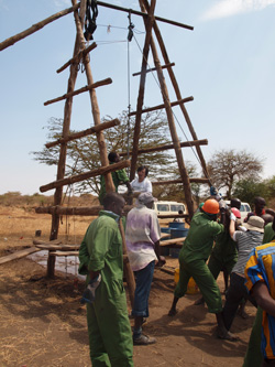 足場の上に立った2人が採掘用パイプを地下深くに差し込むように堀り、それを下でロープを持つグループが思いっきり引っ張って引き上げます。