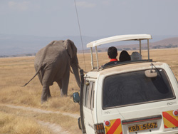 午前中の方が動物が沢山見られるということで、眠い目をこすりつつ早朝6時から出発。車で1時間半弱も走れば、そこはもう野生の王国!アンボセリ国立公園です。